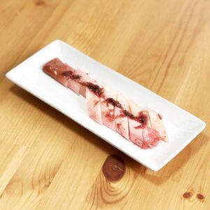収穫時期限定(12月~3月)、深谷市利根川流域限定の甘くて柔らかい深谷ねぎを一本そのまま特殊処理を行い、紀州産梅肉をベースの調味床に漬け込み熟成させた。