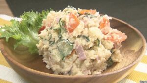 ⑪じゃがいもが冷めたら、にんじん・きゅうり・ハム・マヨネーズを加えて混ぜる。