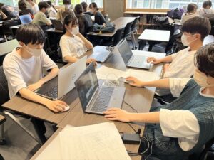 机を向かい合わせにし打ち合わせを行いながら、自分たちの提案すべきプランの方向性を検討していく。
