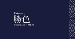 勝色(かついろまたはかちいろ)とは、紺よりもさらに濃い、黒色に見えるほどの暗い藍色のことです。『かちいろ』『かちんいろ』とも。色名の「かつ」は、藍を濃く染み込ませるために布などを搗(かつ)(叩くの意)ことからきており、『搗色』『褐色』の字があてられました。 鎌倉時代になると武士たちが濃い藍染の質実剛健さを好み、さらに「かつ」に「勝」の字をあてて縁起色としたのが色名の由来です。 ちなみに、日清・日露戦争時の軍服の紺色も『勝色』と呼ばれ、特別に『軍勝色(ぐんかついろ)』とされました。 このように勝色は勝利にこだわる武士や軍人に好まれた勇ましい色名といえます。
