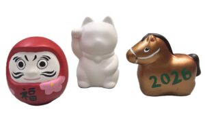 ②2026年の縁起物 午・だるま・招き猫の絵付け(陶器・貯金箱になる)