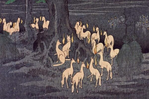 狐のお面は能楽や神楽などの伝統芸能に用いられるほか、祭りや日常生活でも使われていますが、王子には古くから大晦日に各地から集まった狐が大きな木の下で装束を整えて王子稲荷神社に詣でたという伝承があり、北区の大晦日開催の「狐の行列」では、たくさんの方が狐装束の衣装をまとい練り歩きが行われています。