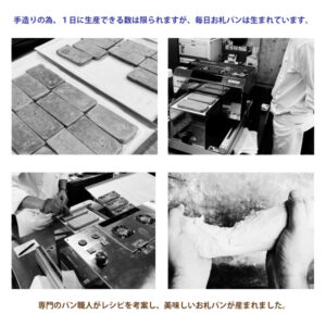 真四角真っ平に整えながらパンが膨らまないようにつくるのは至難の業。平らにしないとお札のプリントがきれいに仕上がりません。また、焼き色がきれいなベージュ色になるよう温度管理も重要です。一筋縄ではいかないところも、職人技で出来上がった逸品です。