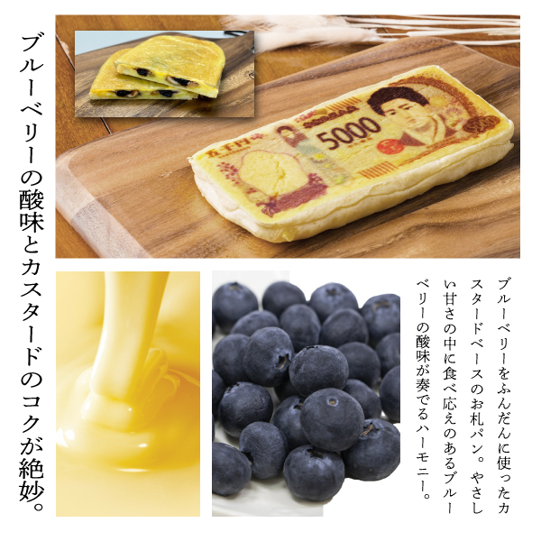 更に香ばしいローストしたピーナッツと冷凍したブルーベリーをシロップに漬け込み熱風乾燥させたものを使用し、ブルーベリー特有の酸味が増し、アクセントとして楽しめるお札パンが出来上がりました。